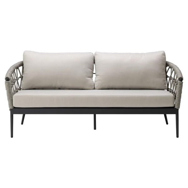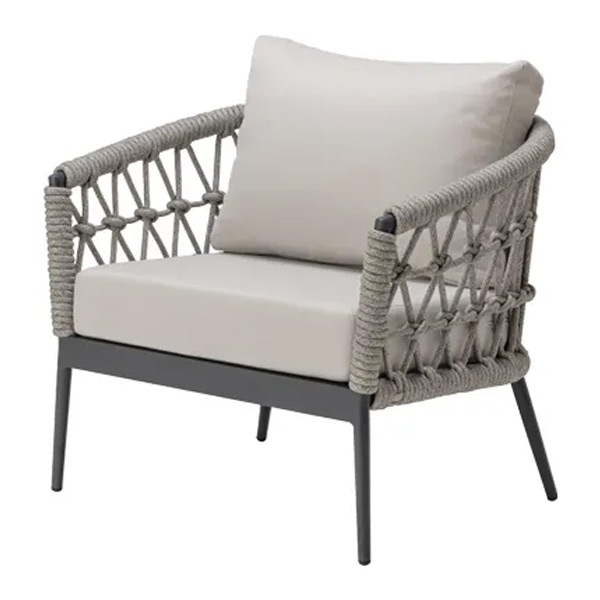 ロープ編みデザインとアルミフレームを組み合わせた屋外対応家具「Muses」。チェア・1人掛・2人掛ソファまで揃い、撥水性クッションと高耐久アルミでテラスやラウンジに上質な雰囲気をプラス。