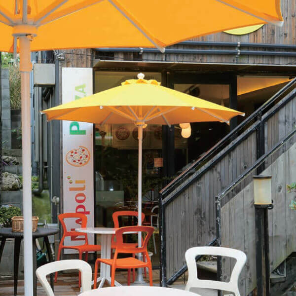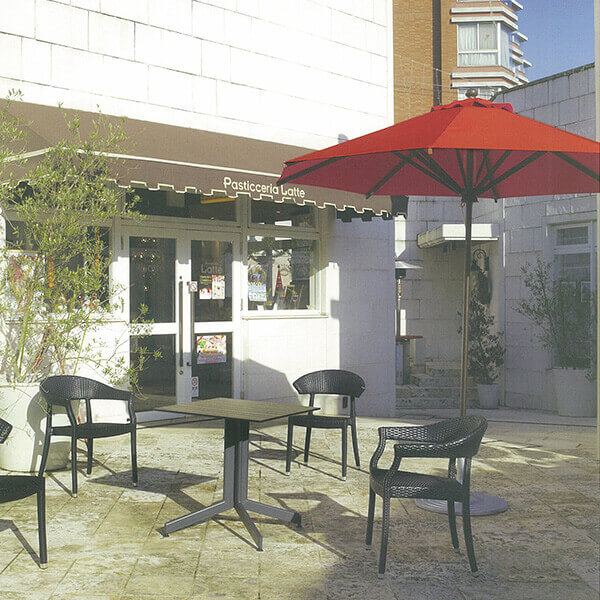 フレームが折れたり、天幕が破れたり、さらには本体が吹き飛ばされたり、転倒して…風がパラソルの損傷の主な原因といっても過言ではありません。さらには思わぬ事故に結びついてしまう事もあります。当社の技術陣は世界に先駆けて"逃風構造"を開発し、パラソルの新しい可能性を引出しました。