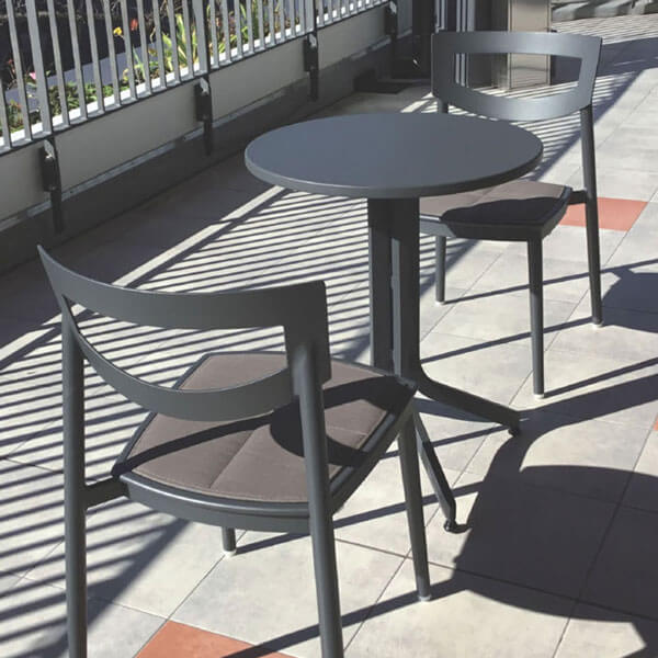 座面に透水性スポンジが入った、座り心地の良いアルミチェア。雨ざらしの屋外でも使用できます。