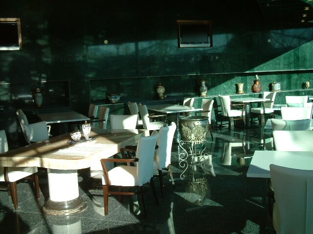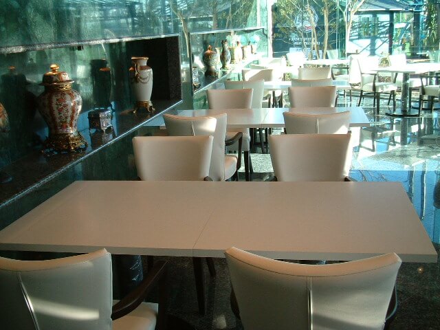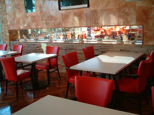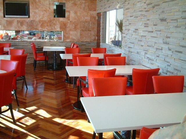 鮮やかな赤い椅子と、さわやかな白いテーブルが店内を明るくしています。