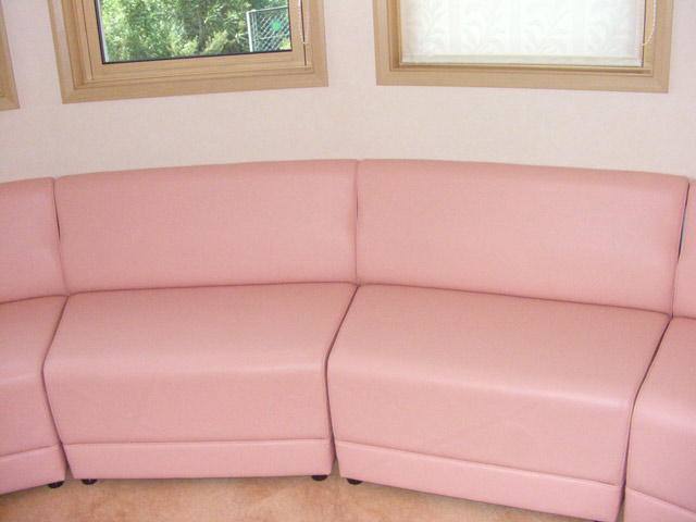 待合用のソファをコーナーにあわせて製作、納品しました。同じカラーのベンチも一緒に納めました。