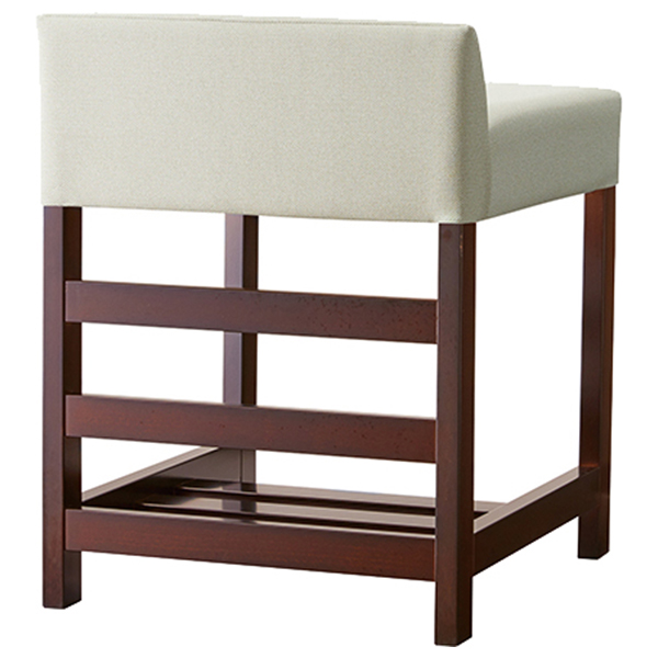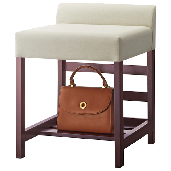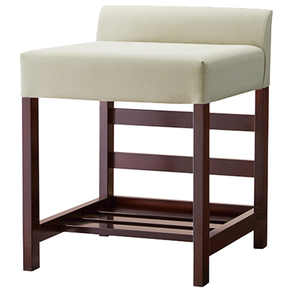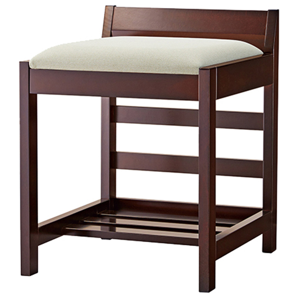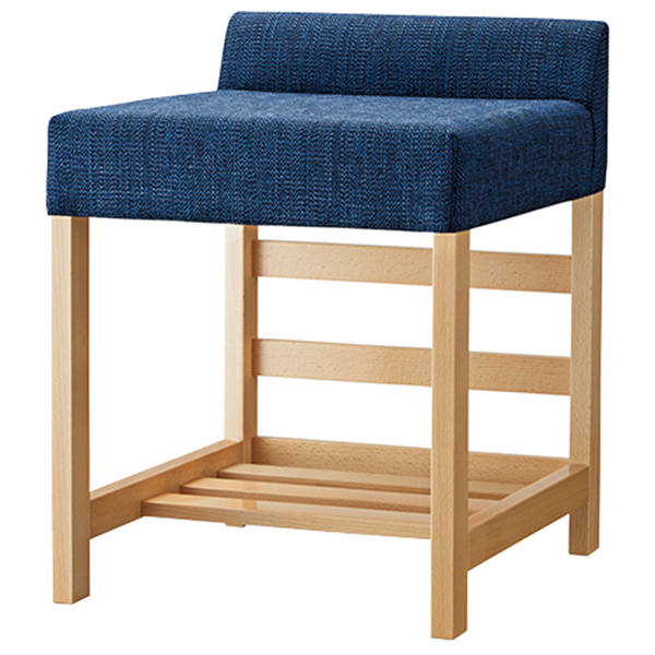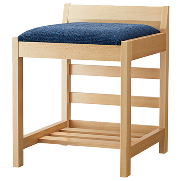 圧迫感を軽減した控えめな背もたれと、収納棚を備えたチェア。背もたれは張ぐるみタイプになっています。