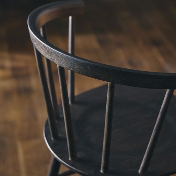 背もたれのスポークデザインが特徴的。ナチュラルウッドの素材感と相まって、どこか懐かしく落ち着いた印象を与えます。