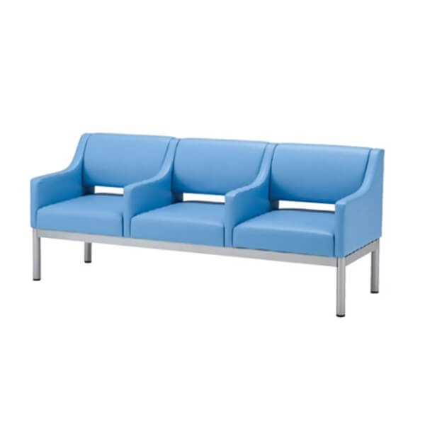 R形状の肘が特徴的なロビーチェア。背面と座面を切り離したお手入れ(掃除)しやすい設計で、中肘付・中肘無しの2パターンと多彩な色を使用。待合空間にご利用いただけます。