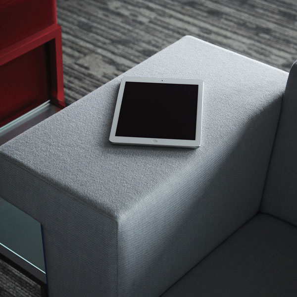 片方の肘幅が広いのがポイントのワーキングソファ。幅広の肘にパソコンやタブレットを置いて作業することもできます。