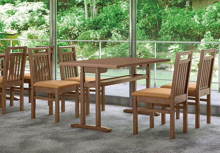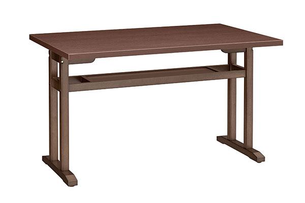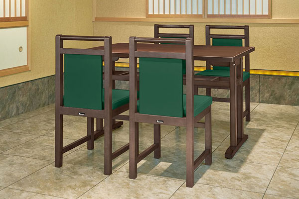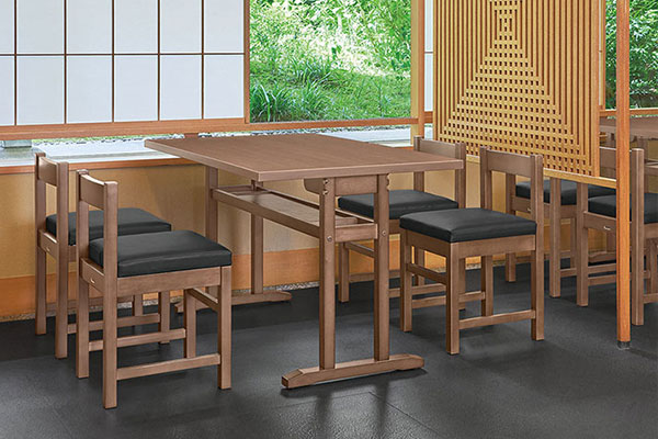 衛生的な抗菌仕様の和風テーブルです。狭い場所でも離着席がしやすい対立脚仕様で、手荷物置きになる棚付きです。天板エッジは、耐久性に優れたABSエッジタイプ。