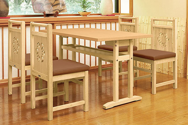衛生的な抗菌仕様の和風テーブルです。狭い場所でも離着席がしやすい対立脚仕様で、手荷物置きになる棚付きです。エッジは共貼り仕上げです。